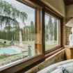 Following is a living room with fireplace, armchairs, and direct access to the garden, from which you can enjoy an amazing view of the pool.