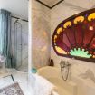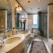 The sleeping area consists of two double bedrooms, both featuring a private bathroom with shower and bathtub (including a hot tub). One of the bedrooms also has a terrace with a small table and some chairs.