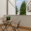 The living room leads directly to a small terrace with breakfast table and chairs.