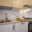 La deliziosa zona giorno è formata da un comodo divano letto matrimoniale, tv, un tavolo da pranzo per 6 persone e una cucina attrezzata con forno, fornelli, lavastoviglie e frigorifero.