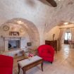 At the entrance of the main trullo guests will be welcomed by a lovely sitting room with a stone fireplace and armchairs. Following on the right there is a spacious living area with a dining table, tv, a 2-seater sof, and a fully equipped kitchen (with oven, stove, dishwasher, fridge and microwave).