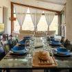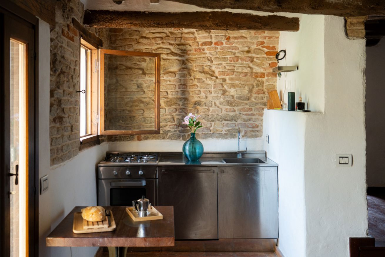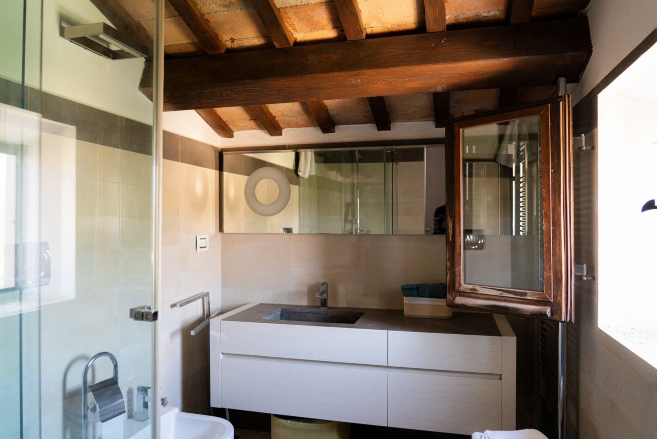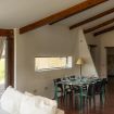 The villa stands out for its charming architecture, with exposed wooden beams, terracotta floor tiles, partially stone walls and a large panoramic window. The interiors, furnished in an elegant rustic style, offer spacious, bright and welcoming rooms.