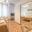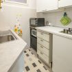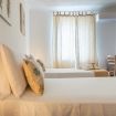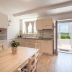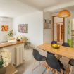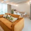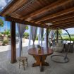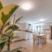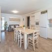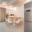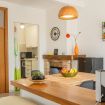 - Apartment 1: The first apartment is located on the ground floor and features an open-plan living area with double sofa bed, tv, dining table for 6 people, and a modern kitchen. The kitchen provides direct access to the covered patio with tables and seating.