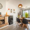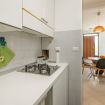 - Apartment 2: The second apartment is set on the first floor, accessible via an internal staircase. Elegantly furnished in Art Déco style, this apartment boasts a bright open-plan living area with dining table for 6 people, tv, fireplace, sofas, and a fully equipped kitchen. From the living room you have direct access to the large panoramic terrace, offering stunning views of the surrounding landscape.