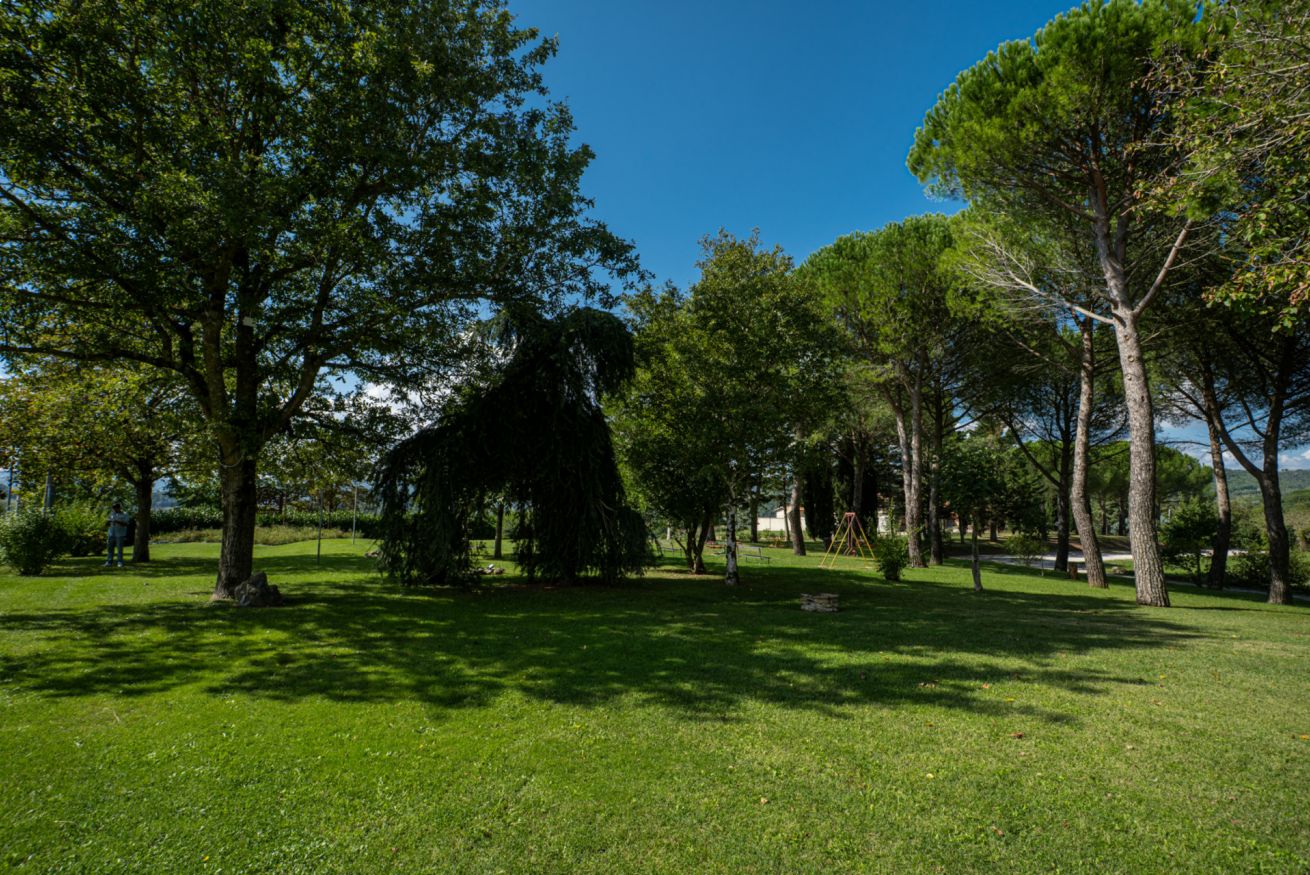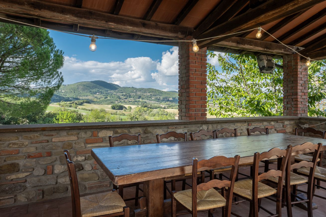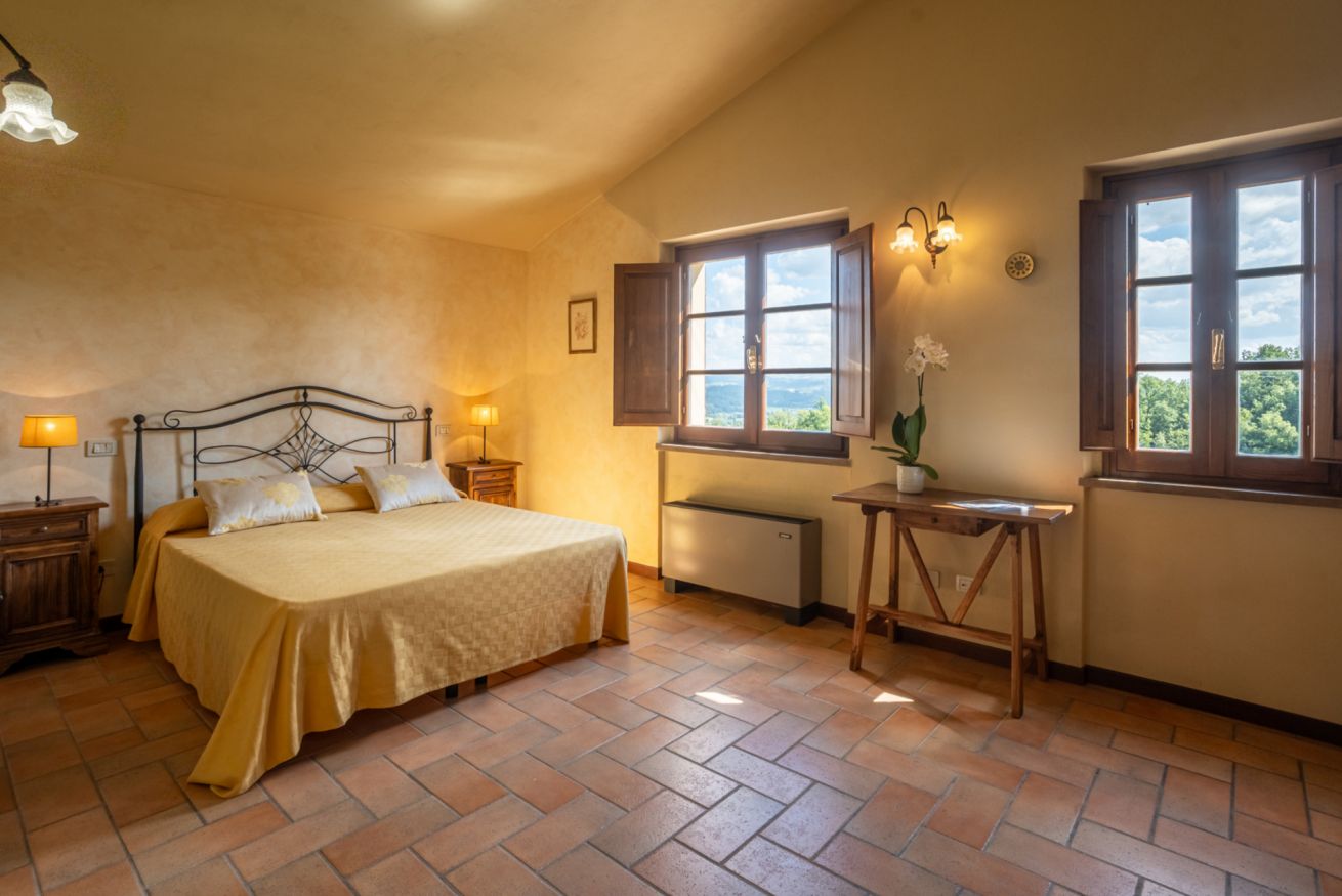 Among the most charming spaces is the covered loggia, furnished with barbecue and large dining tables to host up to 17 guests, a convivial and private area where you can enjoy outdoor meals surrounded by the peace of the Umbrian countryside.