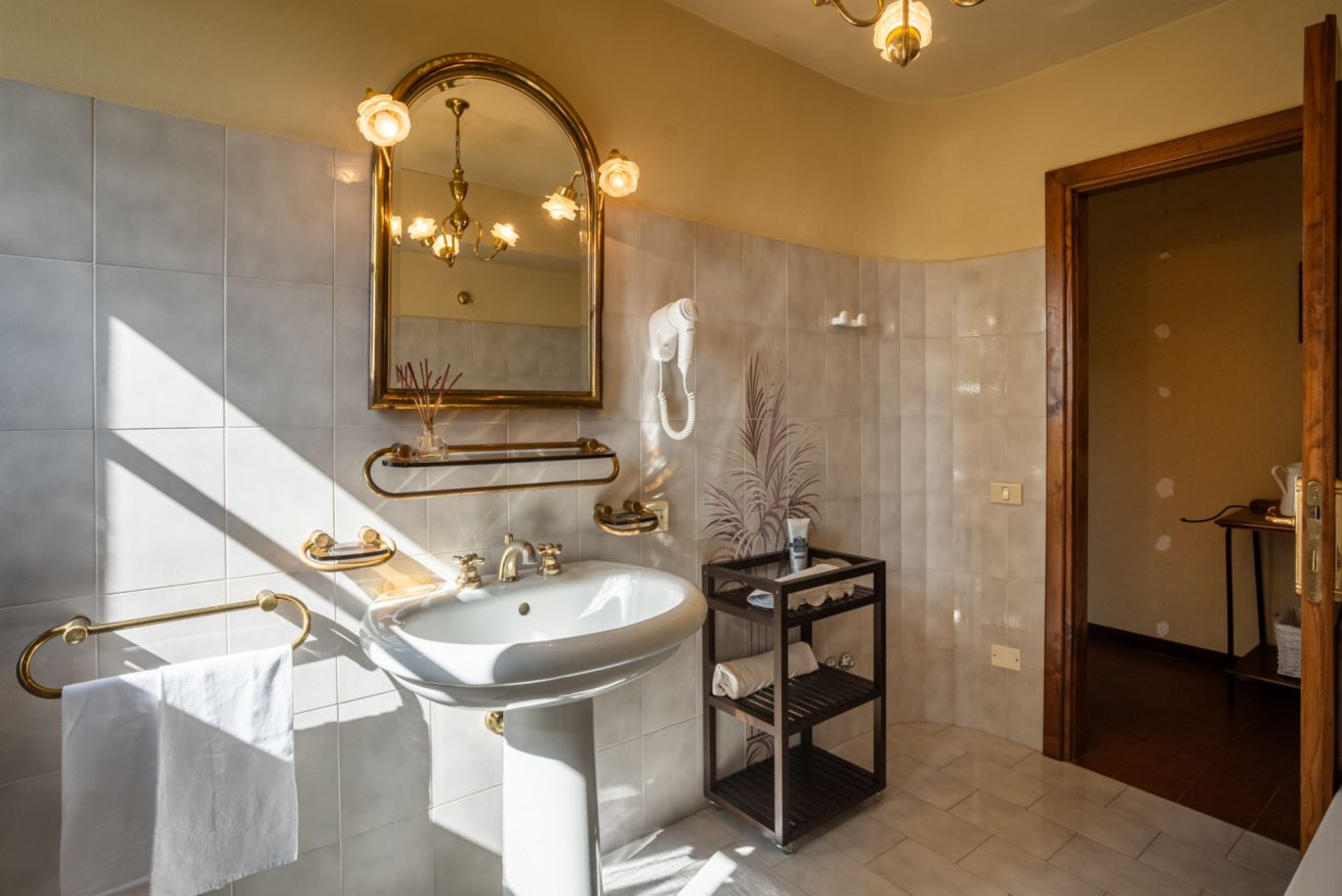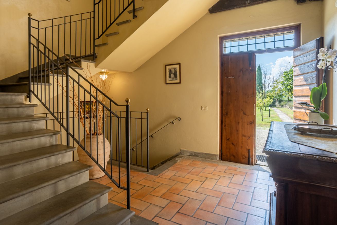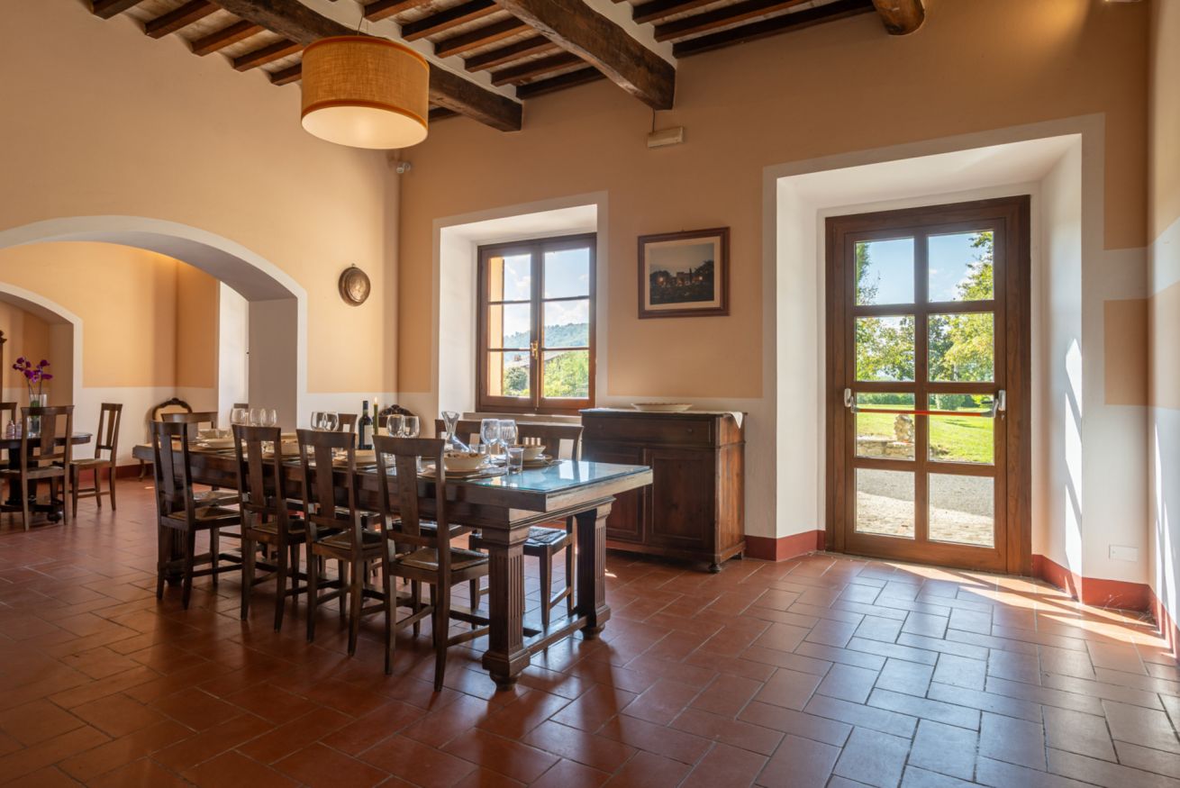 Villa Dogane is an elegant country residence nestled in the green heart of Umbria, among the gentle hills surrounding the peaceful hamlet of Croce di Castiglione, just a few minutes from Città di Castello. This authentic-style property, with its characteristic terracotta-tiled roof and central stone tower, stands out for its refined and welcoming atmosphere. The large private park surrounding the villa is an oasis of peace and beauty: well-kept lawns, cypress-lined avenues, blooming plants, and a play area for children make every corner a delightful place to enjoy at any time of day.