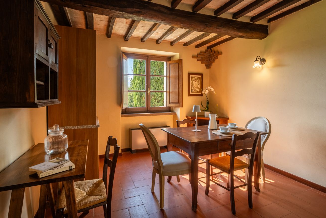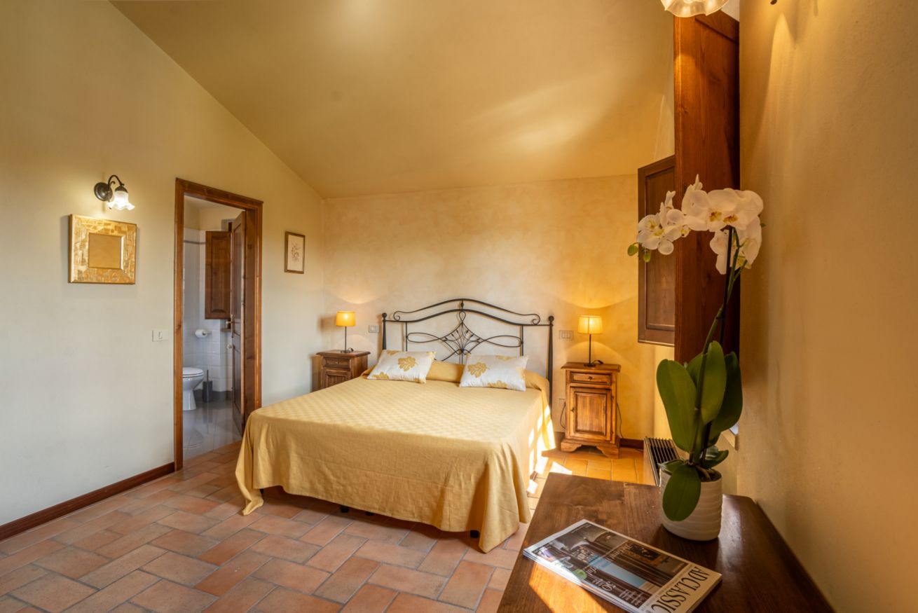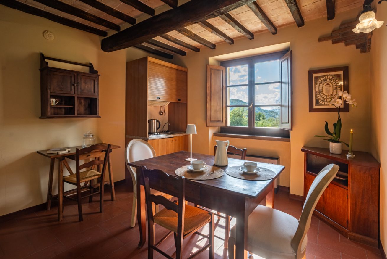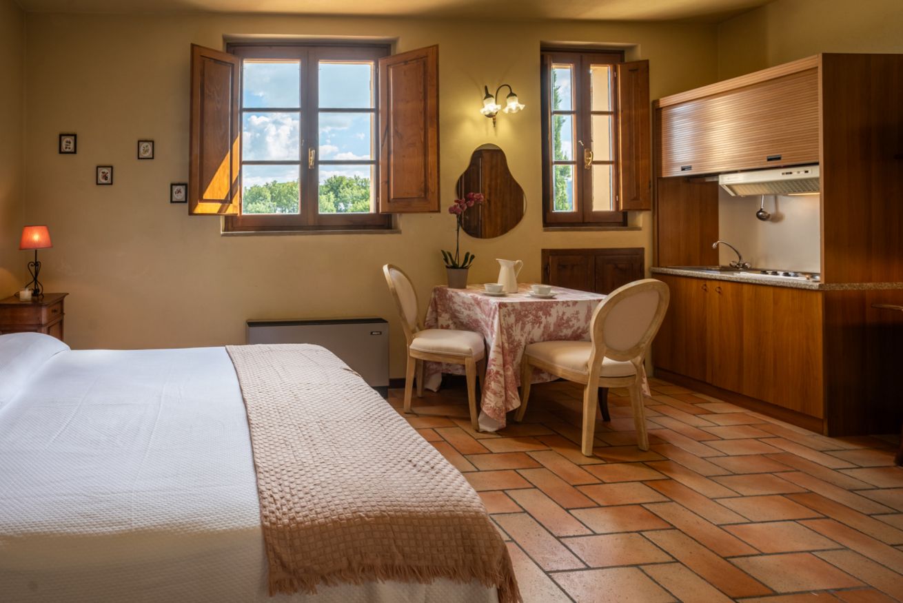 - Apartment 6: refined and panoramic, featuring a dining room with kitchenette, 1 twin bedroom with ensuite bathroom (with shower), and 1 master double bedroom with direct access to the terrace on the charming stone tower, offering a breathtaking view of the surrounding countryside.