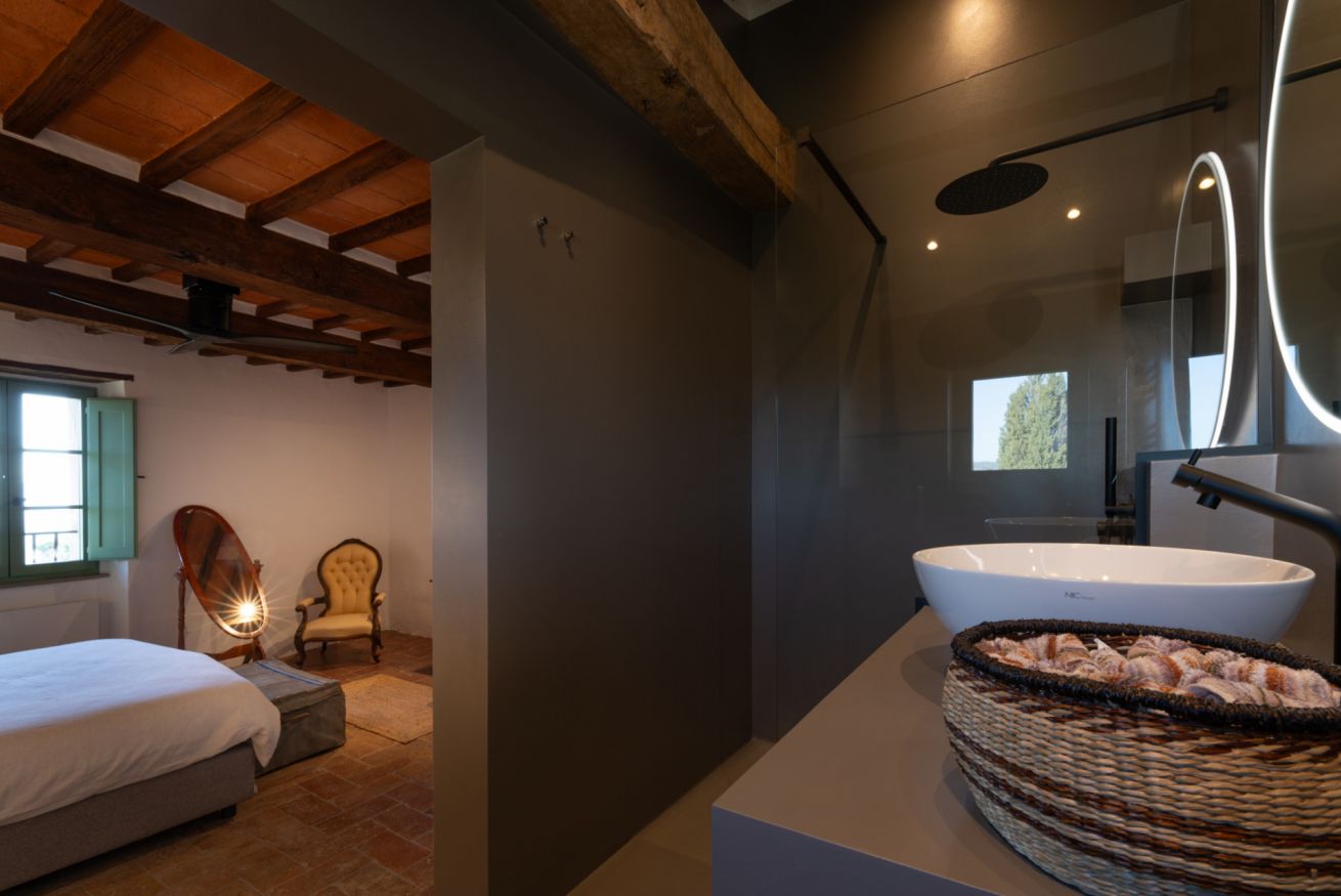 All’esterno, la proprietà è circondata da un giardino privato curatissimo, dove alti cipressi e piante mediterranee incorniciano un’ampia e incantevole vista sulle colline circostanti, mentre in lontananza gli Appennini offrono uno sfondo rigoglioso e maestoso. Questo scenario garantisce la massima privacy e un’atmosfera di totale tranquillità.