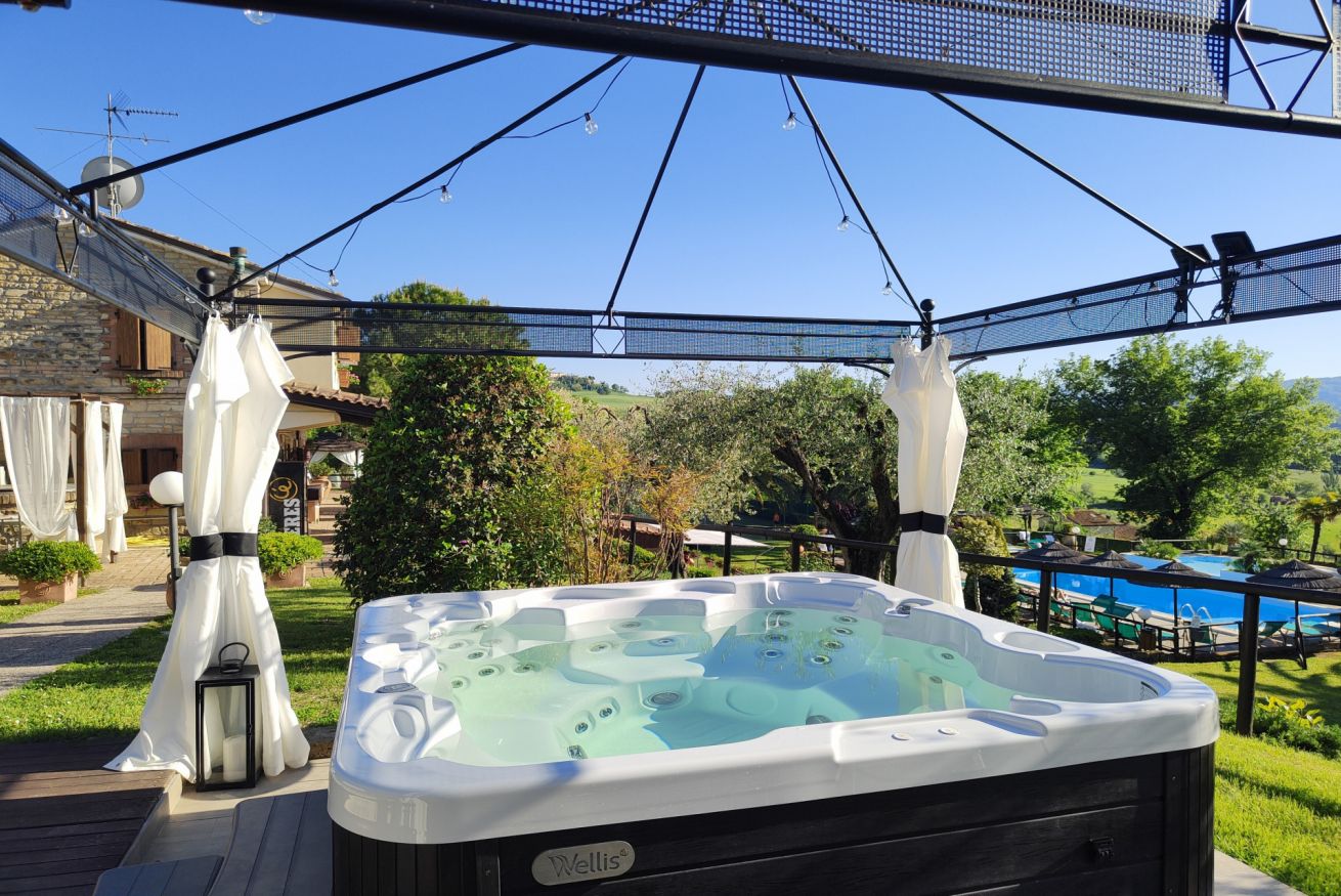 - Vasca idromassaggio esterna riscaldata fino a 6 persone (disponibile tutto l’anno, a pagamento), immersa nel verde e perfetta per momenti di puro relax e rigenerazione.