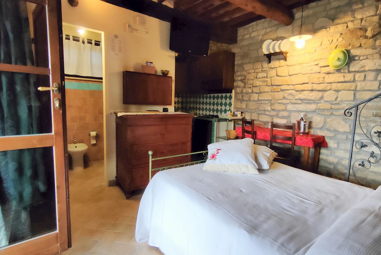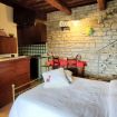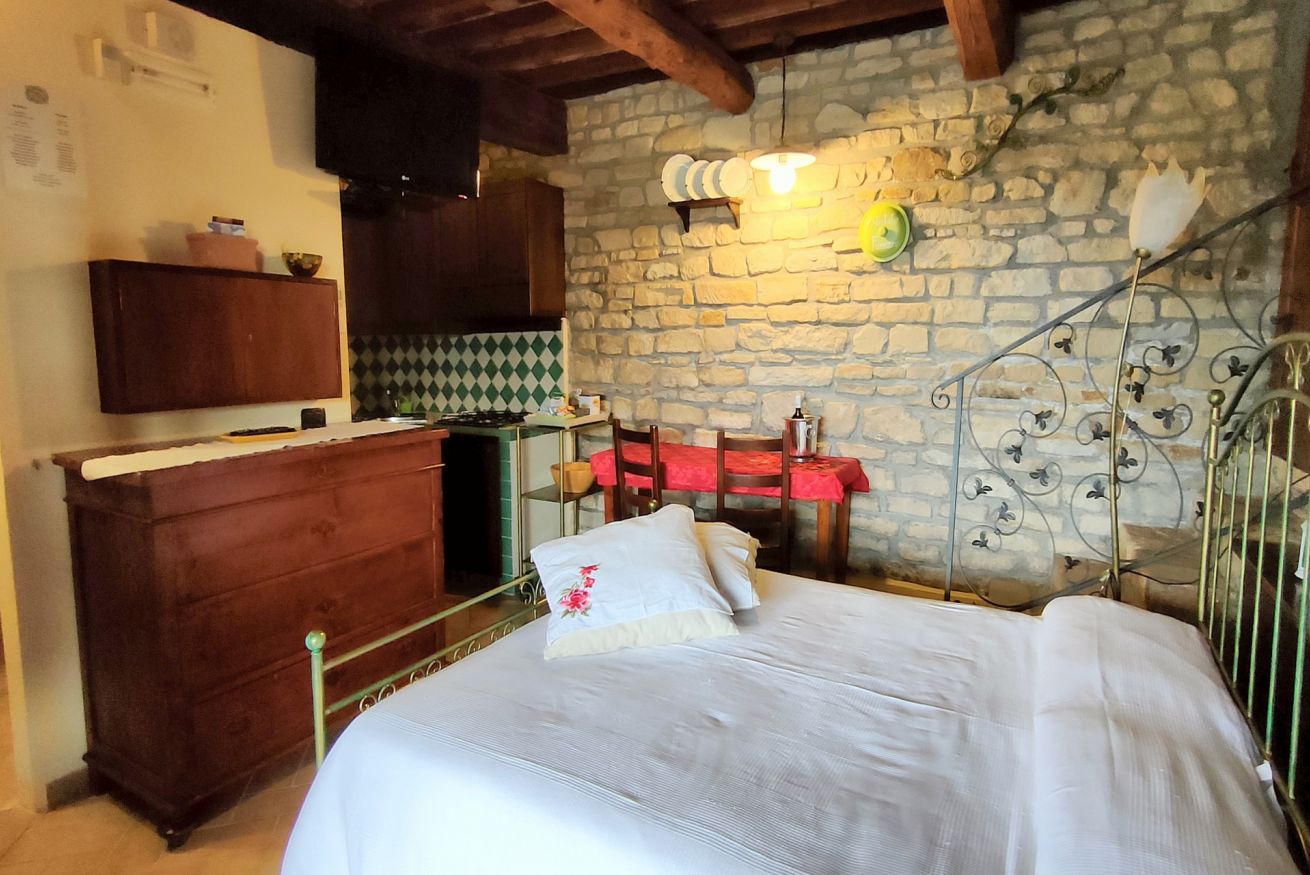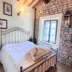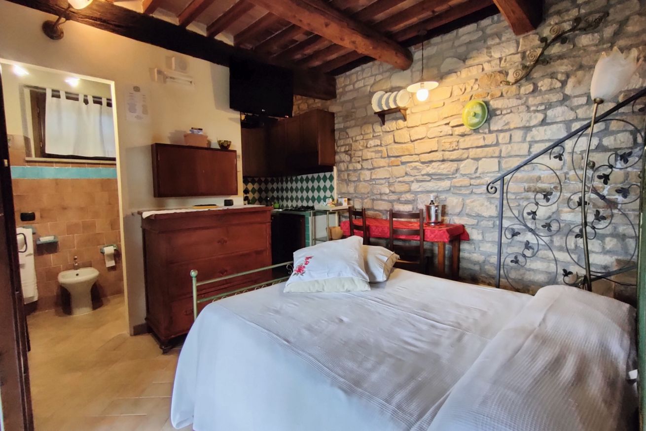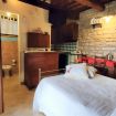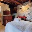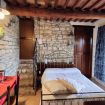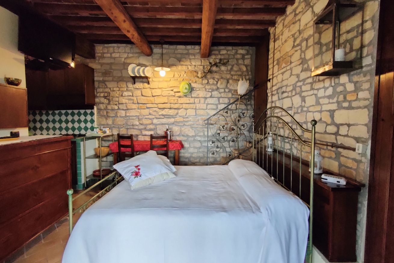 - Appartamento 1 (25 mq, 2 ospiti): grazioso monolocale in pietra al piano terra con ingresso indipendente. Offre un angolo cottura attrezzato con fornelli, microonde, macchina da caffè e area tisaneria, un tavolo da pranzo e 1 letto matrimoniale. Il bagno privato è dotato di doccia. L’alloggio dispone inoltre di un balcone panoramico con splendida vista su giardino, piscina, montagne e cortile interno, oltre a uno spazio esterno esclusivo con tavolo e sedie, perfetto per mangiare all’aperto in totale privacy.