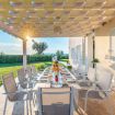 Circondata da un giardino curato con prato, la villa dispone di un pergolato in legno attrezzato con tavolo da pranzo, divanetto e poltrone, perfetto per momenti di relax leggendo un buon libro o sorseggiando un bicchiere di vino.