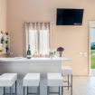 Piano terra: Il piano terra offre un'atmosfera luminosa grazie ai lucernari, le porte a vetro e i colori chiari come il bianco, il marrone e il beige. È composto da un open space suddiviso in: zona pranzo, una moderna e ben attrezzata cucina (fornelli, frigorifero con fabbricatore di ghiaccio, forno, microonde), un angolo bar e un'area lounge con divano, poltrone e tv.