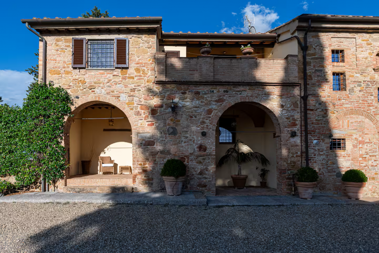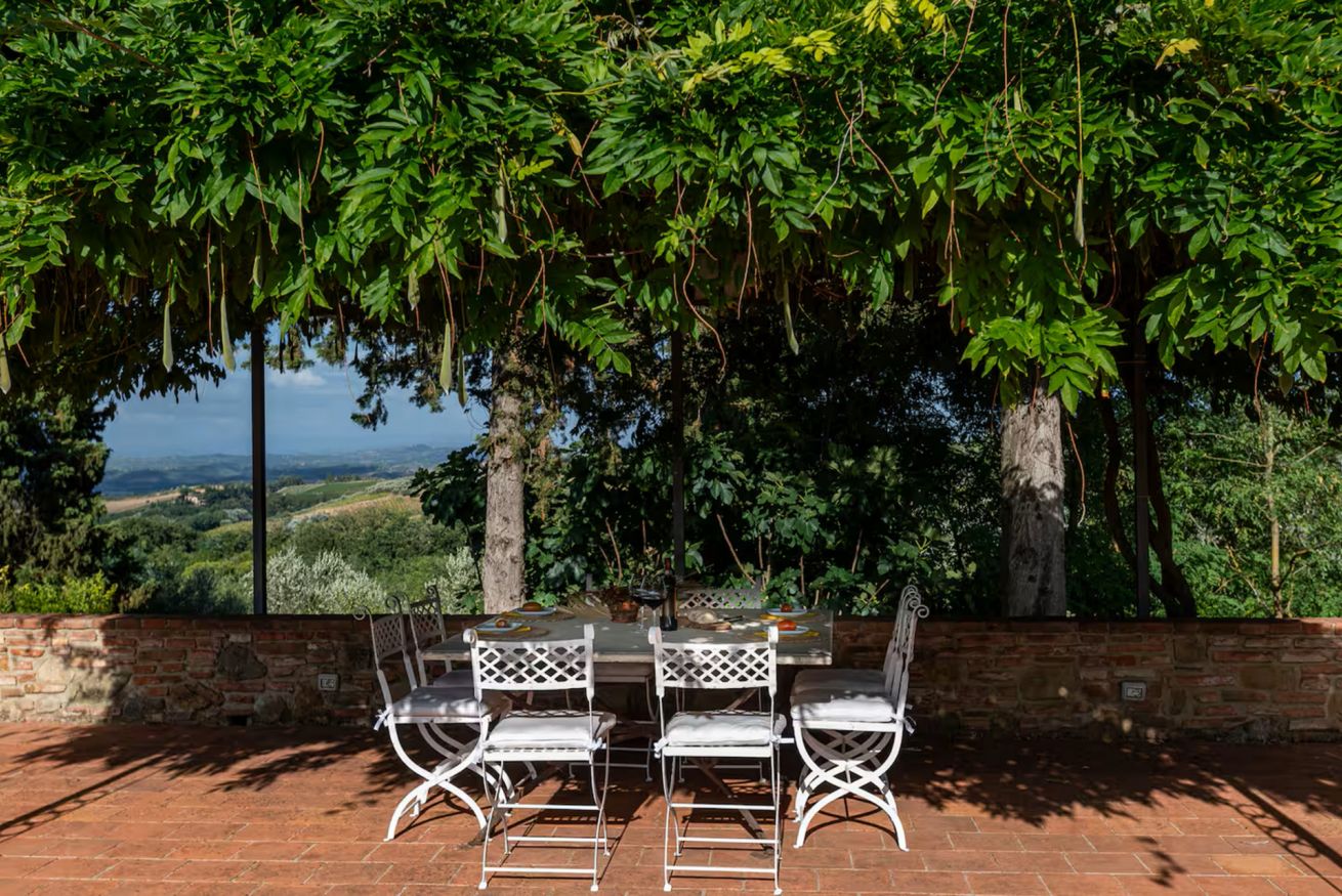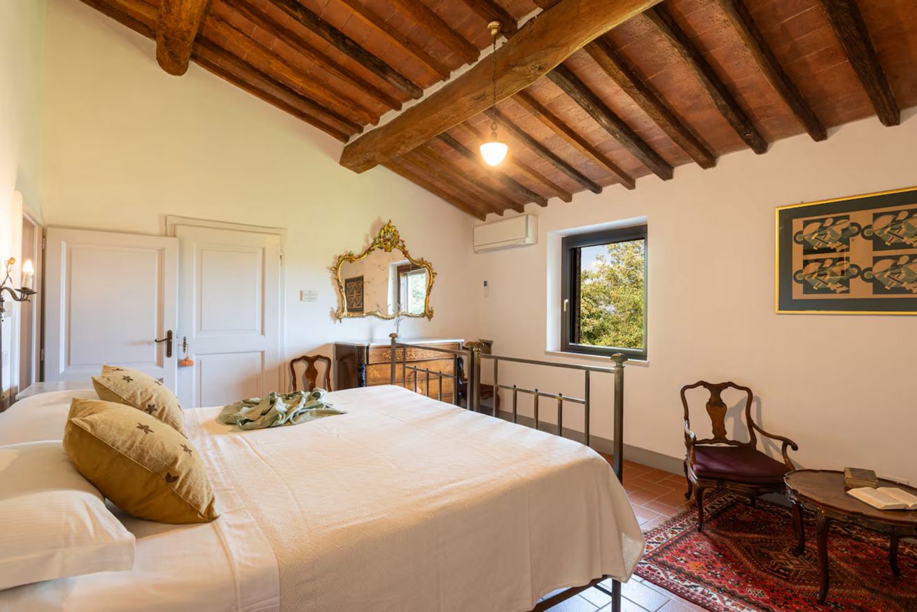 All’esterno, gli spazi sono pensati per vivere appieno la bellezza della campagna toscana. La villa dispone di un’ampia aia, accessibile direttamente dalla porta della cucina, completa di tavolo, sedie e salotti, ideale per pranzi, momenti di relax o aperitivi all’aperto. Dall’aia si accede a una terrazza panoramica con vista sulle colline toscane, offrendo scorci suggestivi e indimenticabili. Un ampio patio arredato con tavolo da pranzo per 8 persone invita a condividere piacevoli momenti all’aria aperta, tra cene al tramonto, barbecue in compagnia e pizze cotte nel forno a legna.