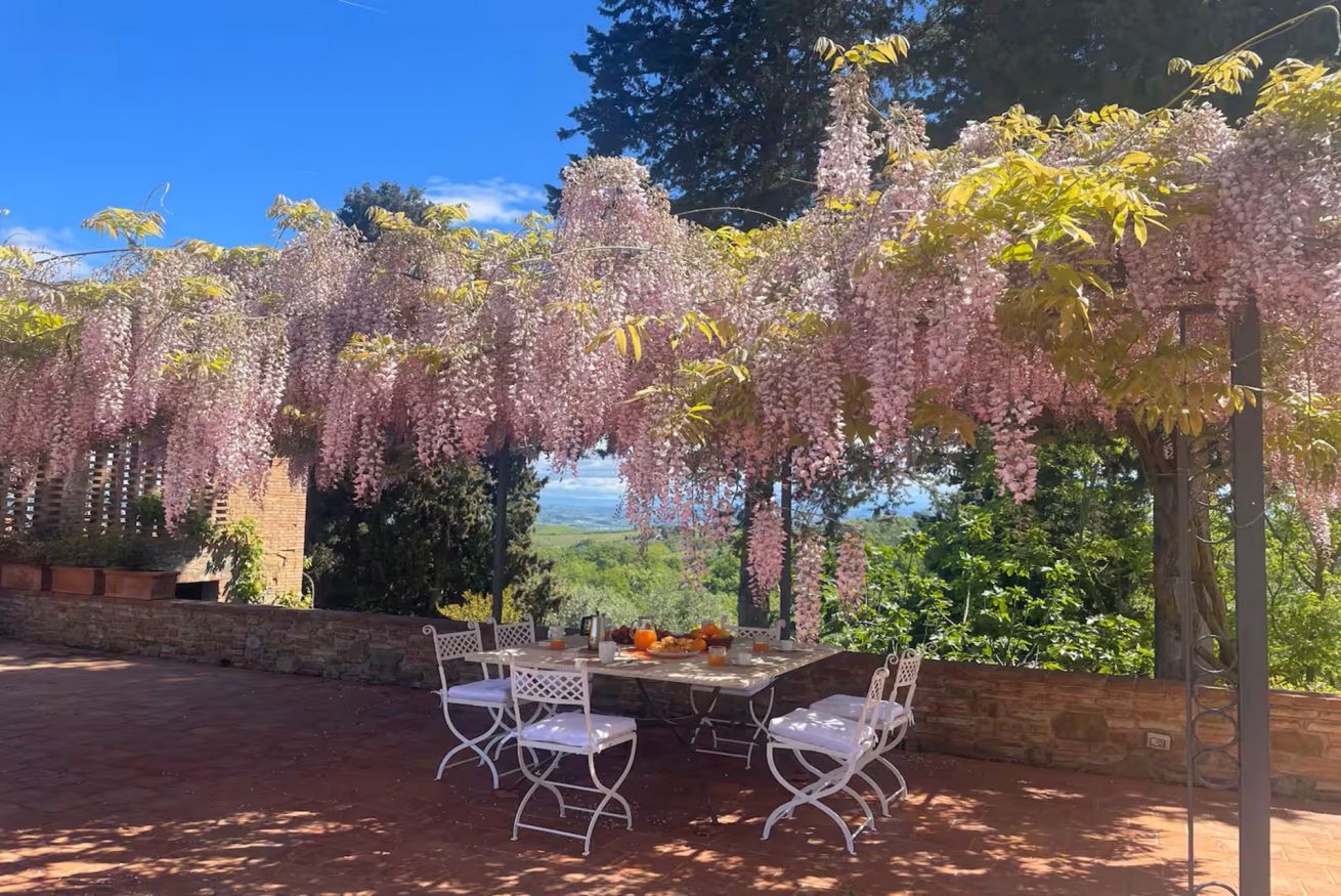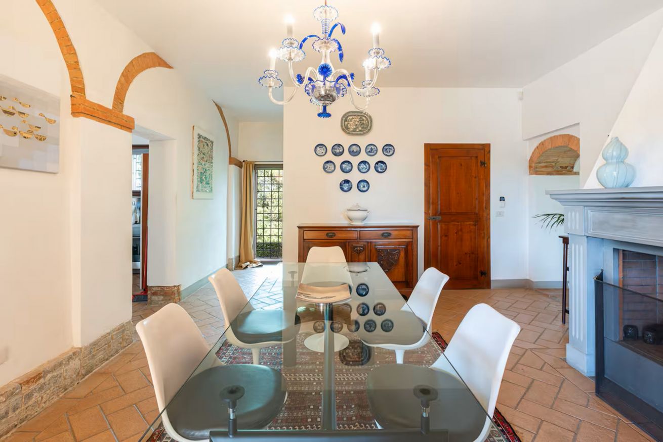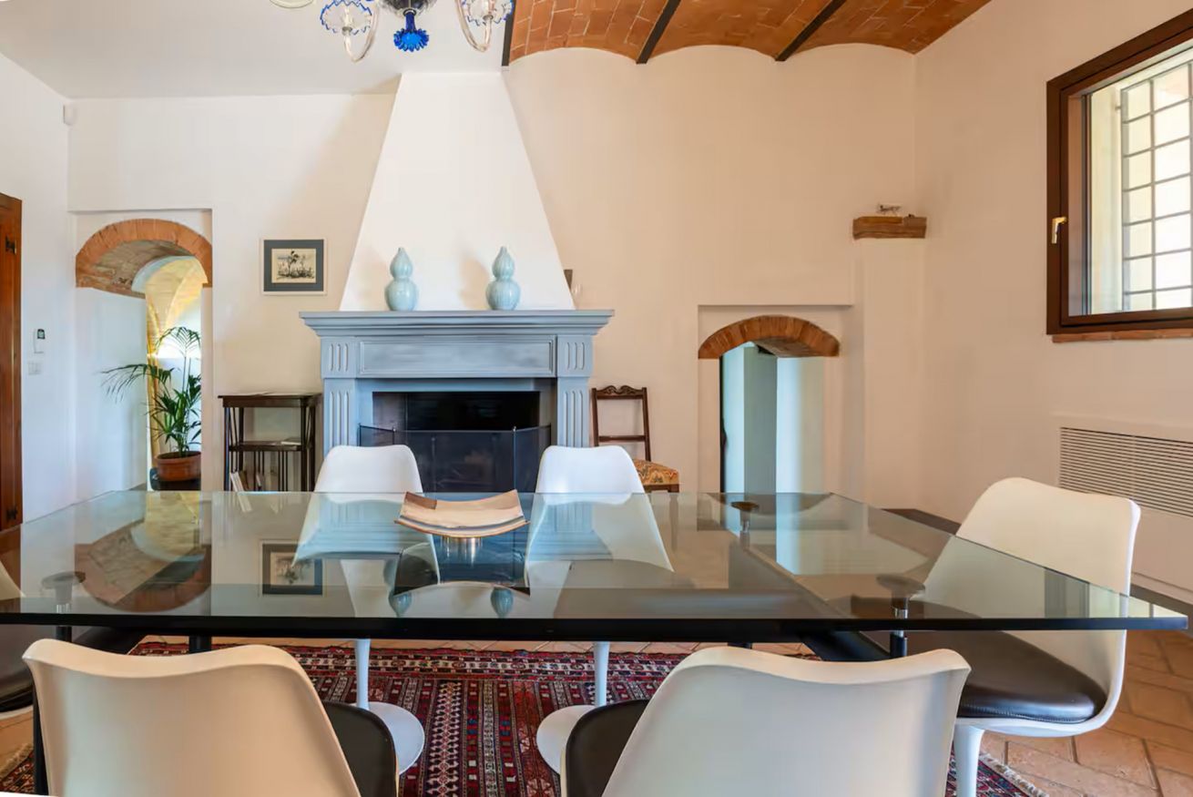 All’esterno, gli spazi sono pensati per vivere appieno la bellezza della campagna toscana. La villa dispone di un’ampia aia, accessibile direttamente dalla porta della cucina, completa di tavolo, sedie e salotti, ideale per pranzi, momenti di relax o aperitivi all’aperto. Dall’aia si accede a una terrazza panoramica con vista sulle colline toscane, offrendo scorci suggestivi e indimenticabili. Un ampio patio arredato con tavolo da pranzo per 8 persone invita a condividere piacevoli momenti all’aria aperta, tra cene al tramonto, barbecue in compagnia e pizze cotte nel forno a legna.