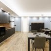 On the ground floor, a single open-space area hosts the fully equipped kitchen (featuring oven, dishwasher, refrigerator, coffee machine, induction hob, and toaster) along with the breakfast room. During the day, this space becomes a versatile area: the tables can be used as a comfortable work zone, offering a quiet and pleasant environment for dedicating time to your projects.