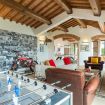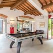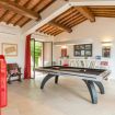 Primo piano: Due rampe di scale conducono al piano superiore (raggiungibile anche dall’esterno). Qui troviamo un'altra spaziosa zona giorno con portefinestre che garantiscono luminosità e accesso diretto alla terrazza con tavolo da ping-pong. Decorato in stile industrial chic con dettagli vintage, quest'ambiente è pensato per il relax e lo svago di tutti. È arredato infatti con: divano, due poltrone, camino, tv satellitare, stereo, lettore dvd, tavolo da biliardo, biliardino e flipper.