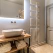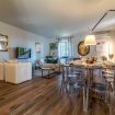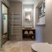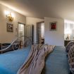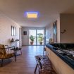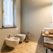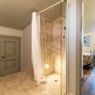 Ground floor: You are welcomed by a bright and large living area (70 m2), elegantly furnished with sofa, armchairs, tv, air conditioning, and dining table for 10 people. From here a door allows access to the spa. Following is a spacious kitchen, finely decorated with travertine top and floors. The kitchen is fully equipped with: stove, microwave, oven, toaster, coffee machine, refrigerator, and dishwasher.