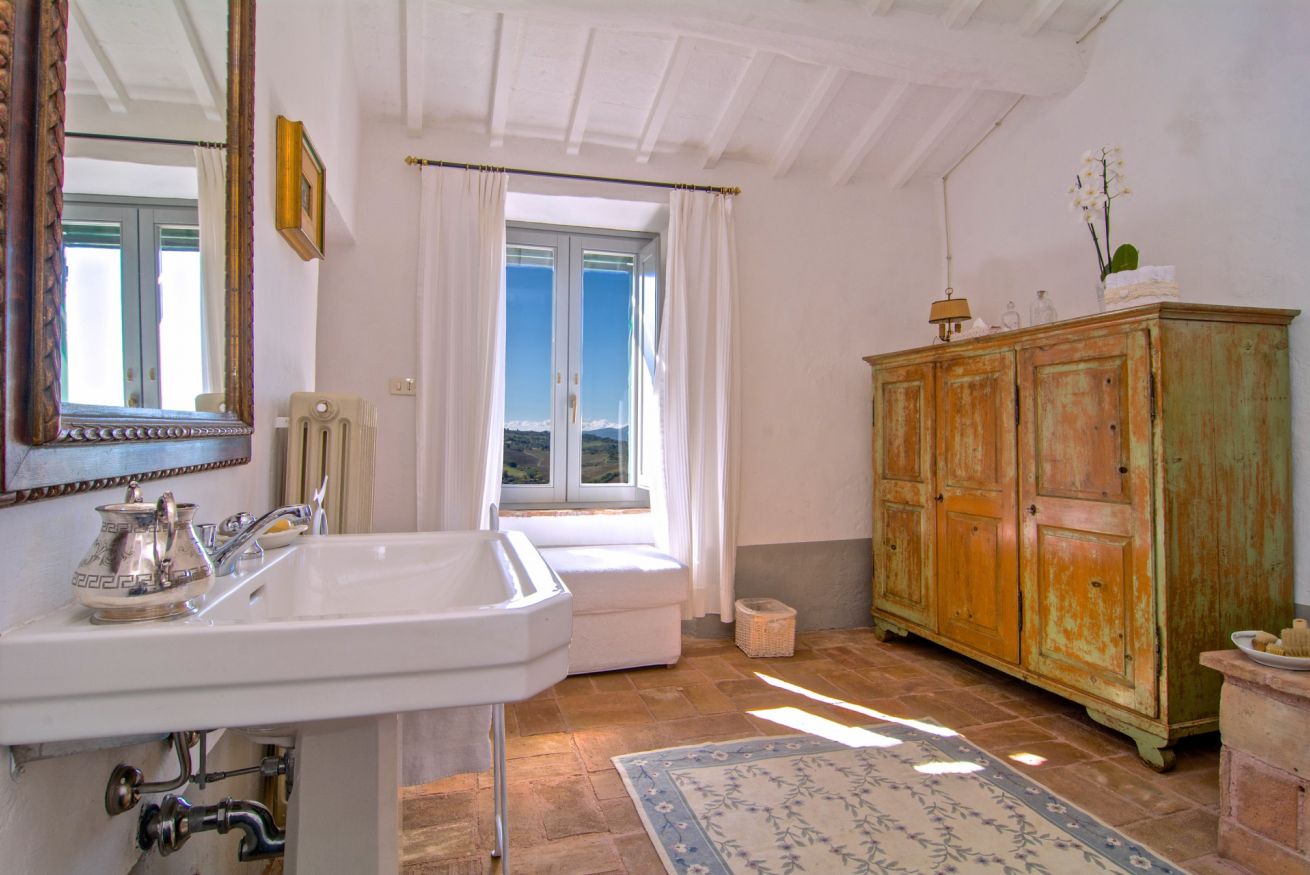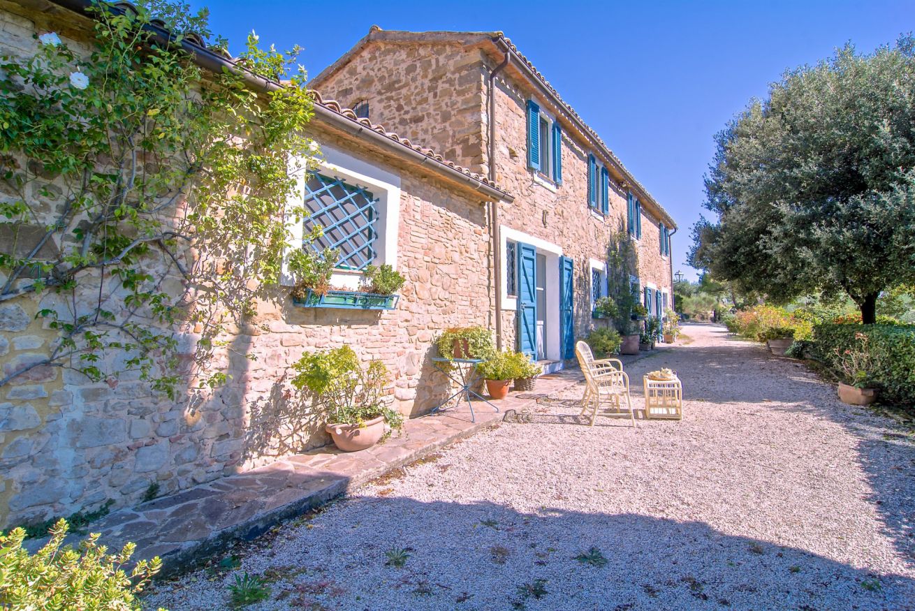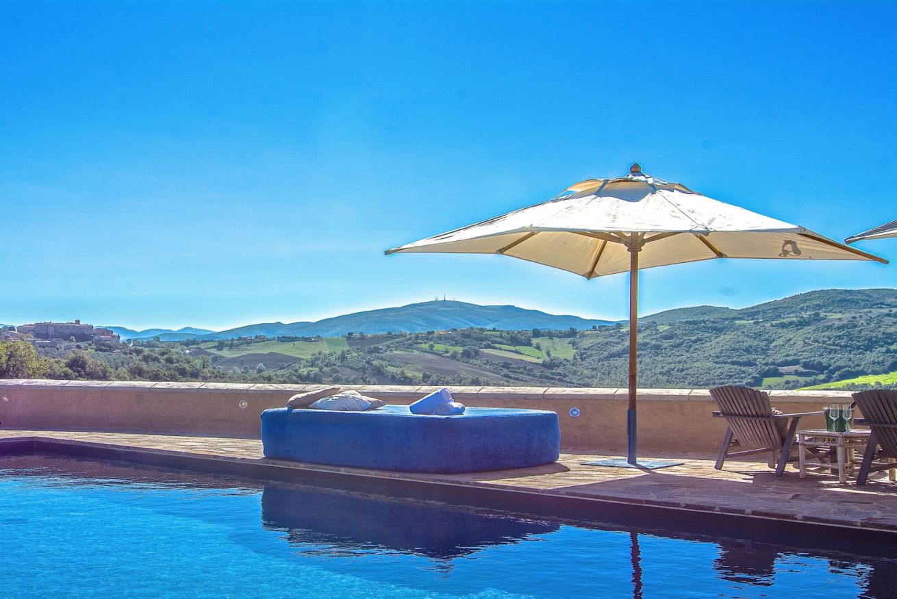 Fiore all’occhiello degli spazi esterni è la magnifica piscina privata panoramica, di forma rettangolare (10 x 5 m, profondità 1,40 m), incorniciata da un’elegante pavimentazione in pietra naturale. Aperta dal 1° Maggio al 1° Ottobre, la piscina è attrezzata con confortevoli daybed imbottiti, lettini prendisole, ombrelloni, doccia esterna, sedie e tavolini, offrendo tutto il necessario per rilassarsi in totale privacy con vista sulle colline.