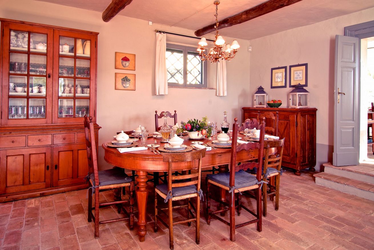Al piano terra, la cucina abitabile si apre su una spaziosa sala da pranzo in grado di ospitare comodamente 12 persone, collegata a un living elegante con divano, due poltrone e un camino che conferisce calore e atmosfera. Nella stessa area si trova una sala da gioco con un tavolo antico e quattro sedie, ideale per momenti di svago e convivialità.