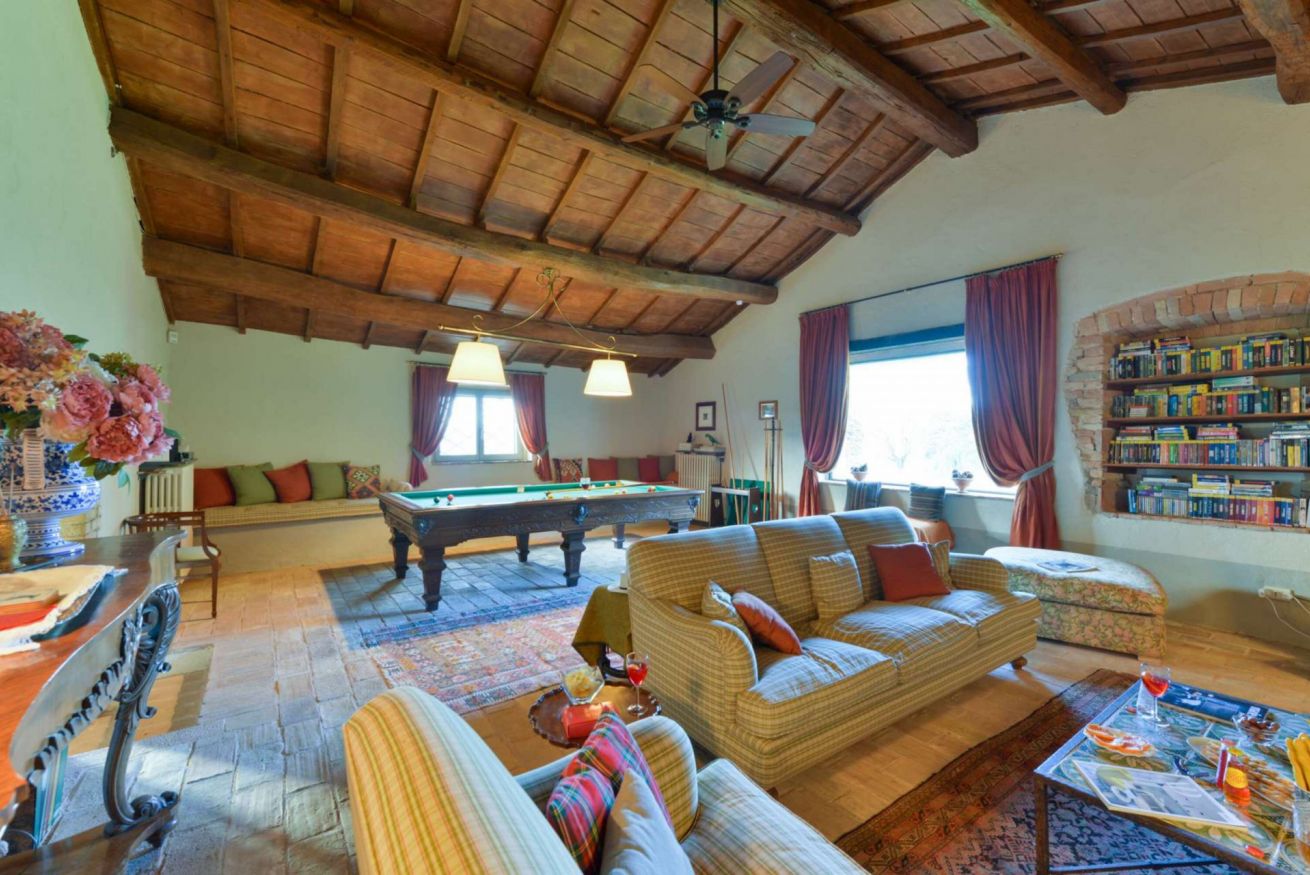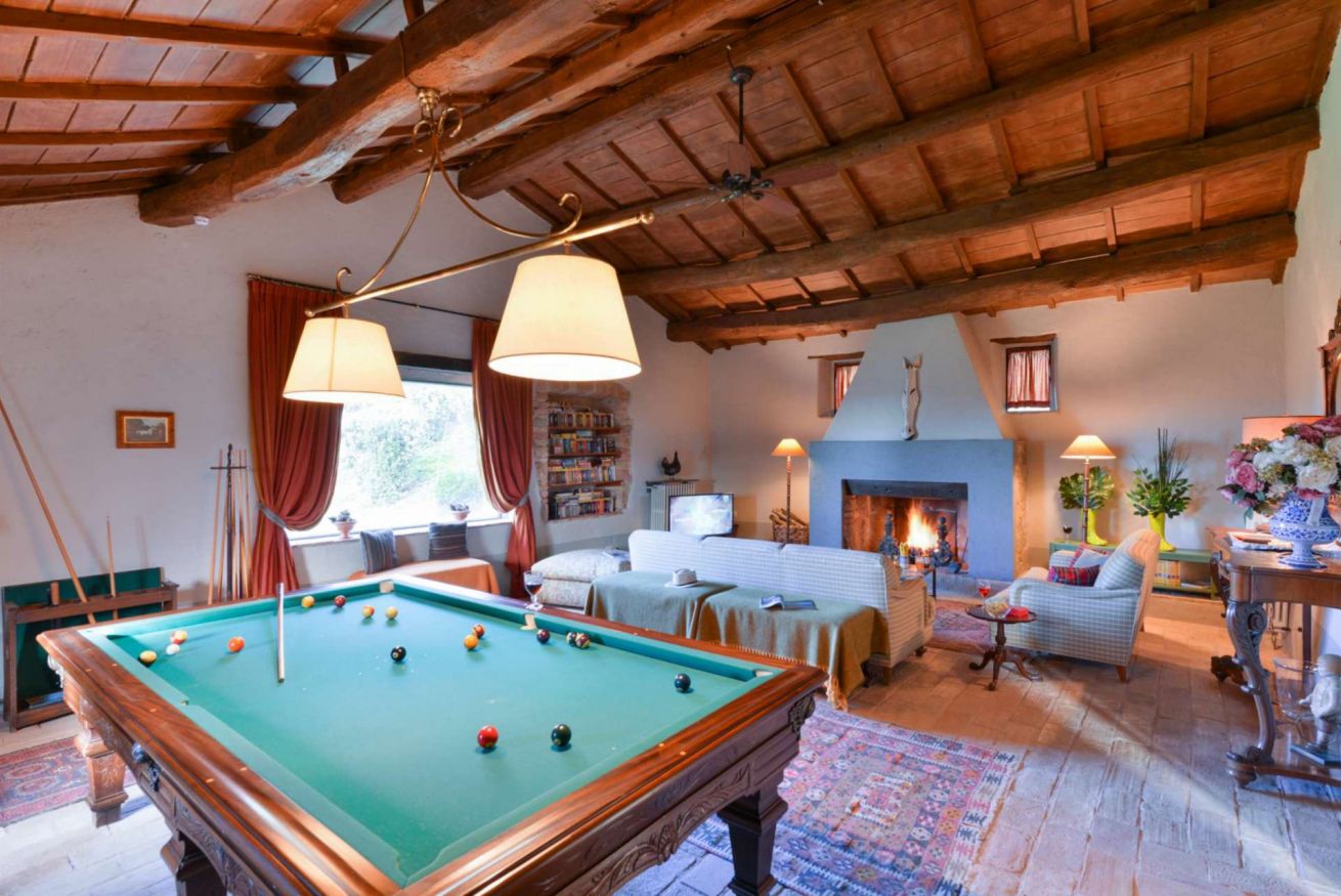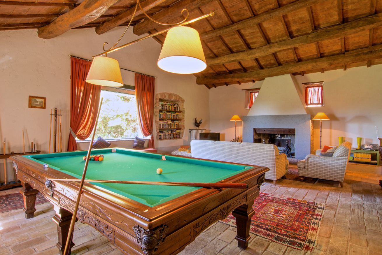 L'ingresso principale conduce a un salone di circa 60 mq, impreziosito da un grande biliardo, un salotto con camino e tv, perfetto per rilassarsi o intrattenere gli ospiti.