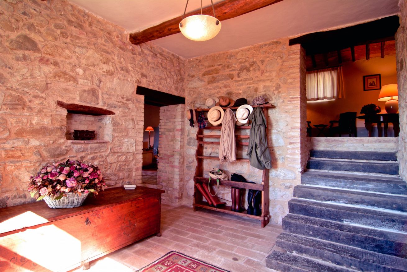 Villa padronale in stile rustico con giardino e piscina privata, immersa nella campagna umbra, vicino Gualdo Cattaneo. Può ospitare fino a 12 persone, ha 6 camere e 5 bagni.