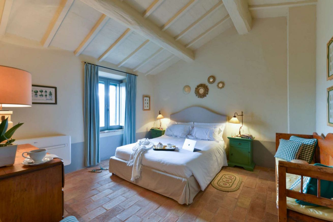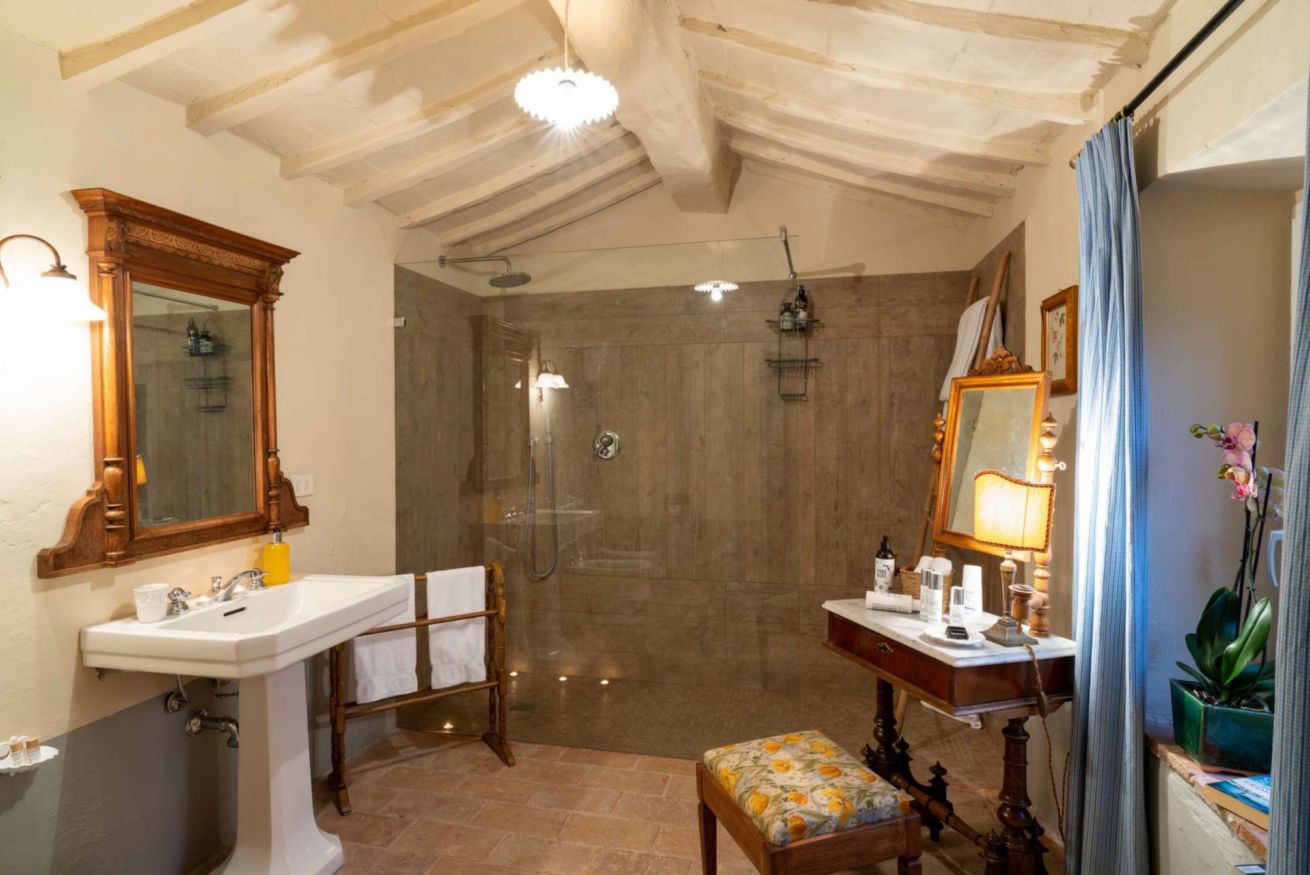 Infine, salendo due gradini, si arriva all'ultima camera, raffinata e confortevole, con letto matrimoniale separabile, aria condizionata, un’anticamera con armadio e un grande bagno ensuite dotato di una doccia di tre metri.