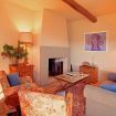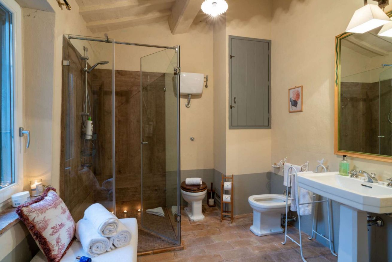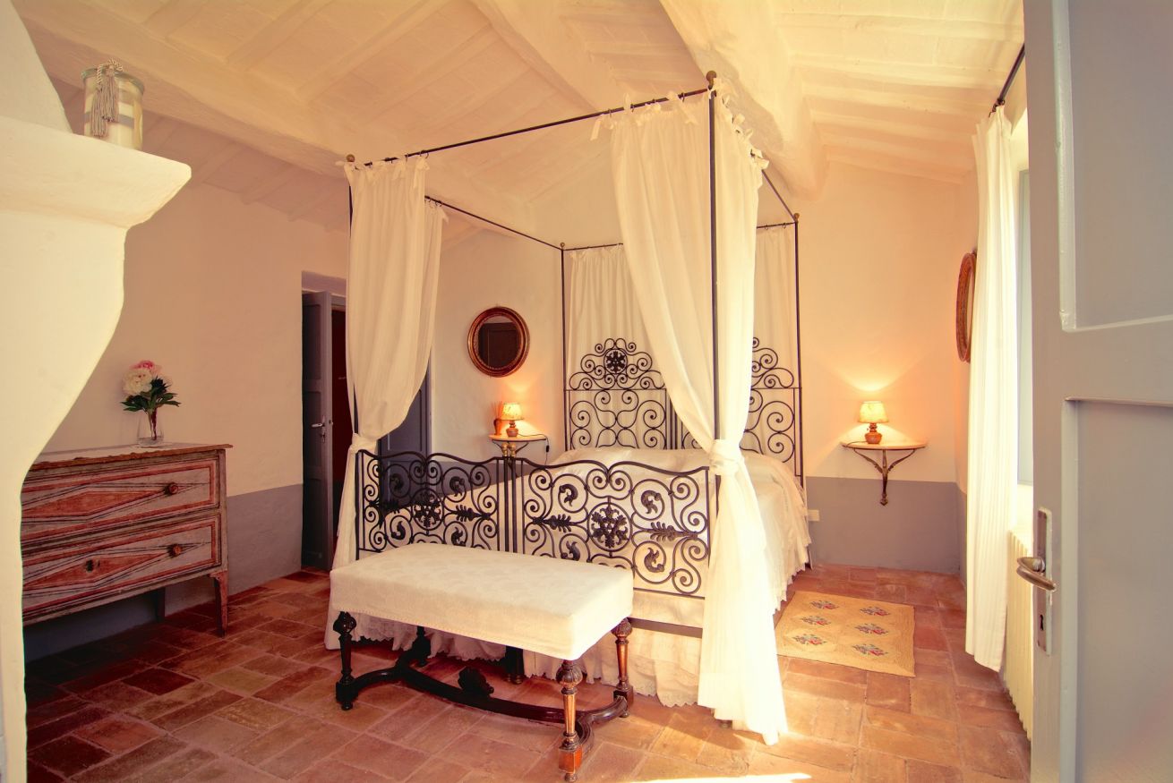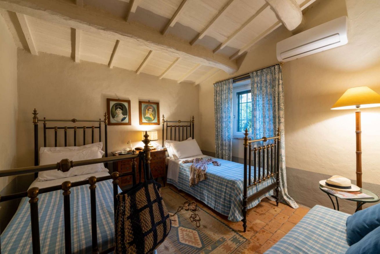 Salendo altri cinque gradini, si trova la camera padronale, elegante e spaziosa, con letto a baldacchino, camino, aria condizionata e un ampio bagno ensuite con vasca, ideale per momenti di totale relax. Un corridoio conduce poi a due camere matrimoniali – di cui una con letti separabili – entrambe dotate di aria condizionata e di un bagno condiviso con doccia, separate da un pratico disimpegno.