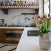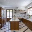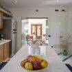 Following is a spacious island kitchen with direct access to the garden, fully equipped with stove, oven, microwave, blender, refrigerator, dishwasher, toaster, and coffee machine.