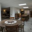 Basement: The spacious, fully furnished basement features an open-plan living area with a wooden dining table for 10 people, a second table for 4, and a comfortable corner sofa.