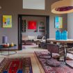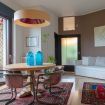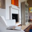 - a sitting room with sofa, dining table, fireplace, and outdoor terrace overlooking the garden;
