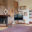 - a living room with sofa, tv, fireplace, and outdoor terrace overlooking the garden and pool;