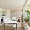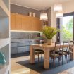 - a kitchen equipped with: tv, oven, refrigerator, dishwasher, dining table, utensils, and outdoor terrace overlooking the side garden;