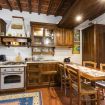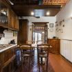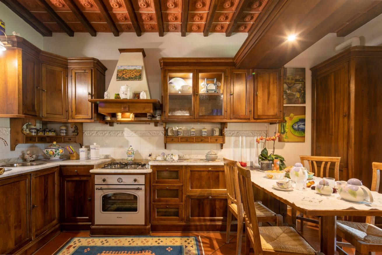 Piano terra: Il piano terra è formato da: una luminosa sala da pranzo con tavolo in legno e camino; una cucina abitabile completamente attrezzata (con forno, frigorifero, lavastoviglie, macchina da caffè, microonde). Segue una camera matrimoniale e un bagno con doccia.
