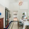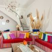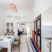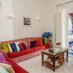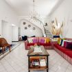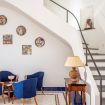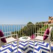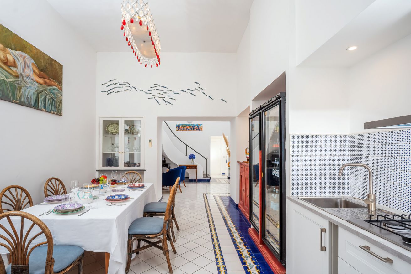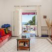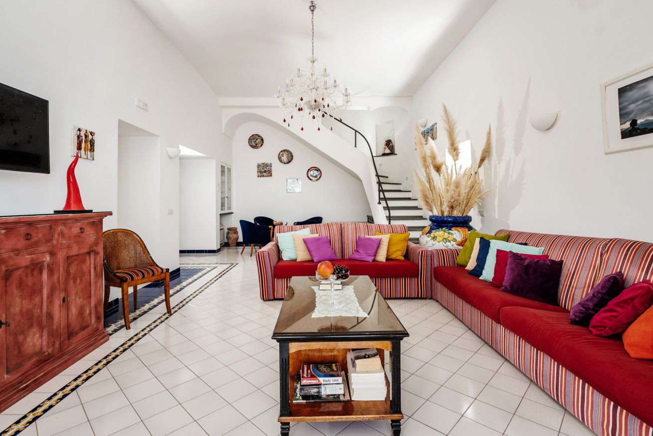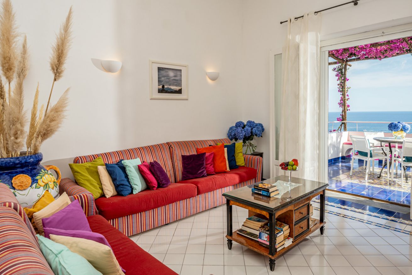 The interiors reflect a contemporary Mediterranean style, with warm, vibrant colors, artistic ceramics, and refined handcrafted details that celebrate local tradition, creating elegant, luminous spaces full of character. From the living room, a French door leads to a breathtaking panoramic terrace, furnished with a table and seating – perfect for admiring the sea and enjoying unforgettable outdoor moments.