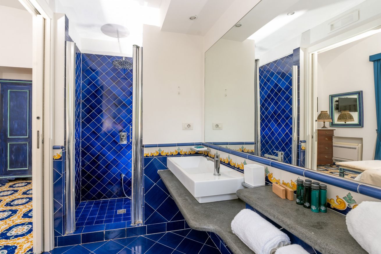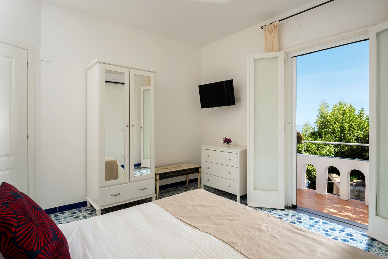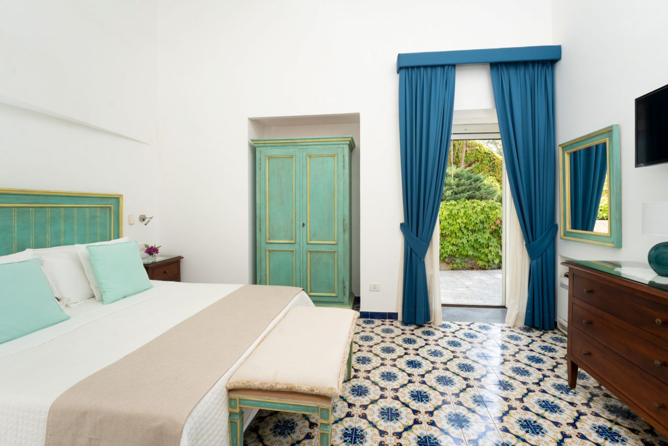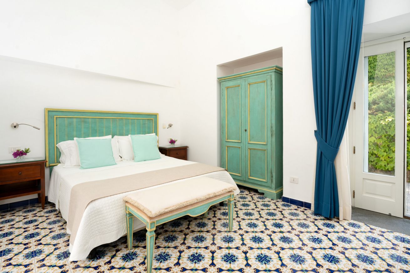 Each bedroom is a little corner of paradise, finished with colors and details that evoke the magic of the Mediterranean. Designed to offer comfort, relaxation, and authentic elegance, they harmonize perfectly with the timeless charm of the Amalfi Coast. All bedrooms feature an ensuite bathroom with shower, king-size bed, tv, air conditioning, and window mosquito nets. The interiors also boast panoramic views, private balconies, or terraces – perfect spots to admire the sparkling sea, breathe in the scent of the surrounding gardens, and enjoy moments of pure outdoor relaxation, basking in the sun and the gentle Amalfi climate.