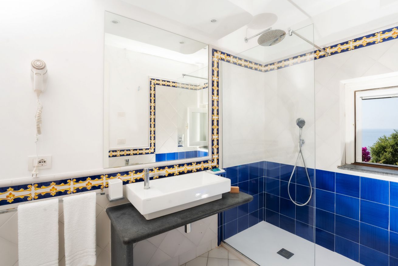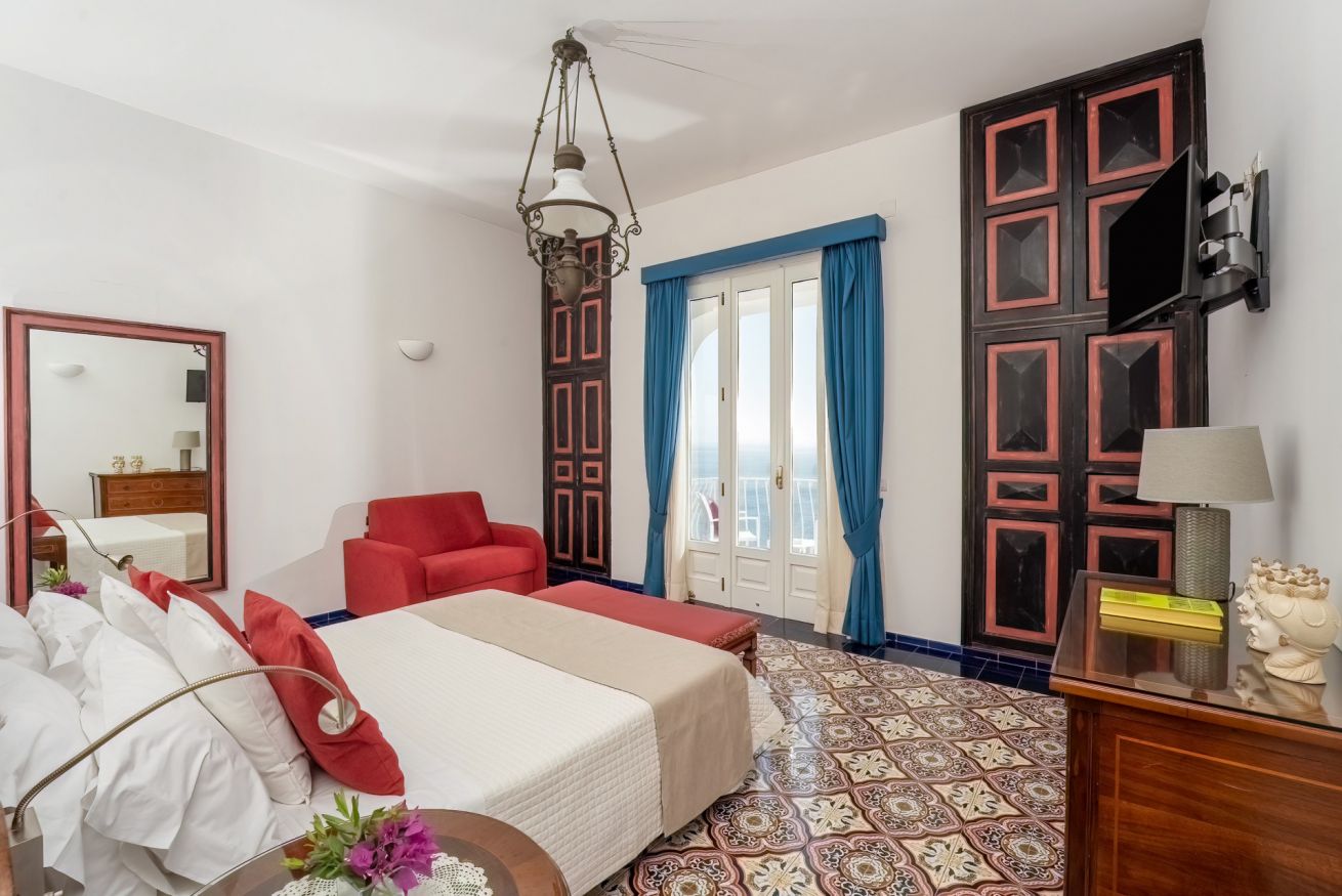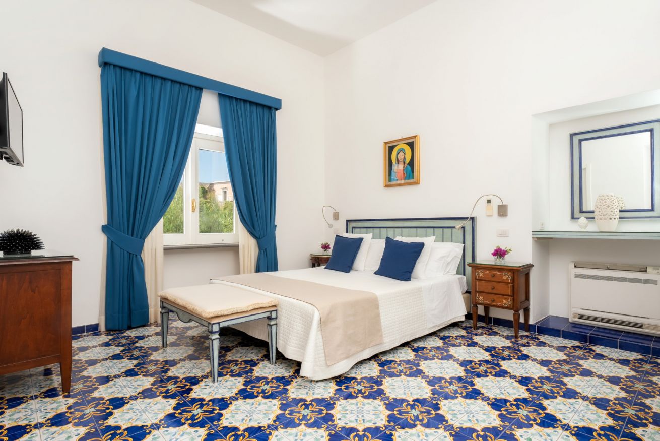 Each bedroom is a little corner of paradise, finished with colors and details that evoke the magic of the Mediterranean. Designed to offer comfort, relaxation, and authentic elegance, they harmonize perfectly with the timeless charm of the Amalfi Coast. All bedrooms feature an ensuite bathroom with shower, king-size bed, tv, air conditioning, and window mosquito nets. The interiors also boast panoramic views, private balconies, or terraces – perfect spots to admire the sparkling sea, breathe in the scent of the surrounding gardens, and enjoy moments of pure outdoor relaxation, basking in the sun and the gentle Amalfi climate.