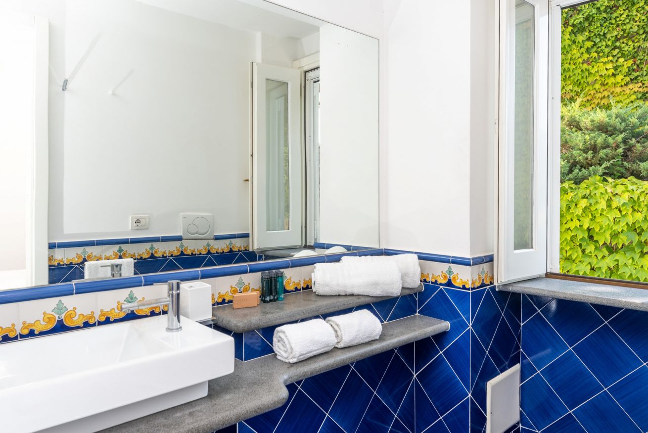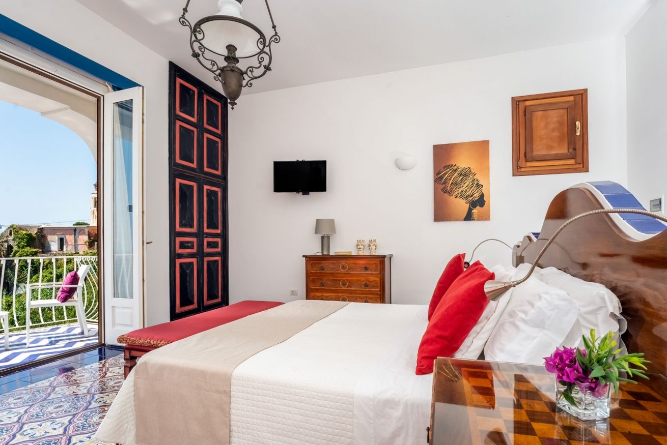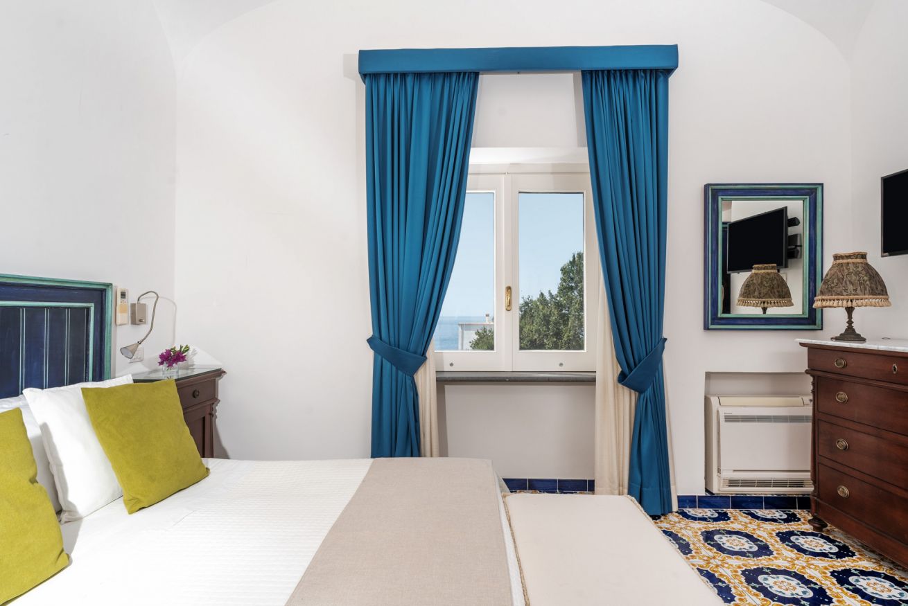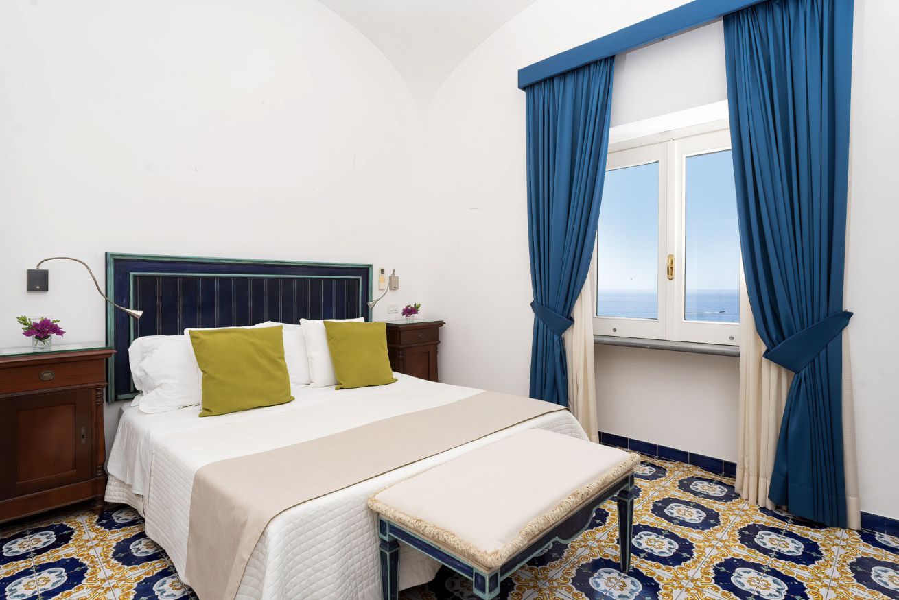 Each bedroom is a little corner of paradise, finished with colors and details that evoke the magic of the Mediterranean. Designed to offer comfort, relaxation, and authentic elegance, they harmonize perfectly with the timeless charm of the Amalfi Coast. All bedrooms feature an ensuite bathroom with shower, king-size bed, tv, air conditioning, and window mosquito nets. The interiors also boast panoramic views, private balconies, or terraces – perfect spots to admire the sparkling sea, breathe in the scent of the surrounding gardens, and enjoy moments of pure outdoor relaxation, basking in the sun and the gentle Amalfi climate.